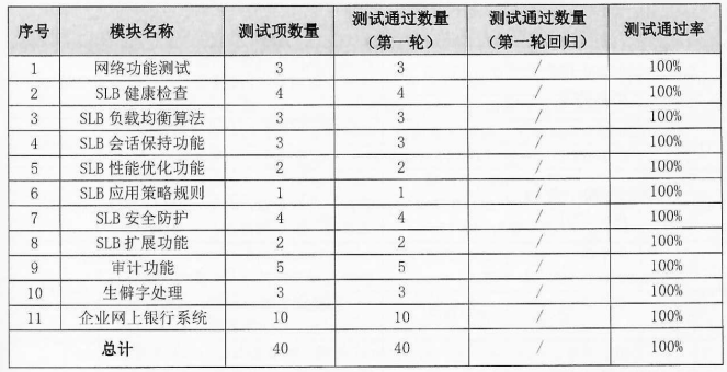 功能性方面:測試范圍包括網(wǎng)絡(luò)功能測試、SLB健康檢查、SLB負(fù)載均衡算法、SLB會話保持功能、SLB安全防護(hù)、SLB擴展測試等11個模塊,共計執(zhí)行40條用例,均通過測試。